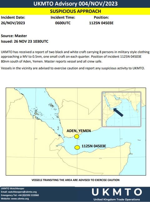 עוד נמסר כי כוחות חיל הים האמריקני היו מעורבים בתקרית, בה זוהתה תנועה חשודה של שמונה בני אדם בבגדים צבאיים שהגיעו באמצעות שני כלי טיס. מוקדם יותר, בארגון הבריטי האחראי על תעבורה וסחר ימיים, מסרו כי קיבלו קריאה שנשמעה בקשר וממנה עלה חשד לתקיפה של כלי שיט.
