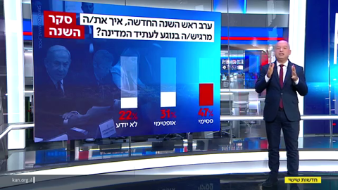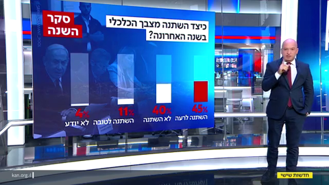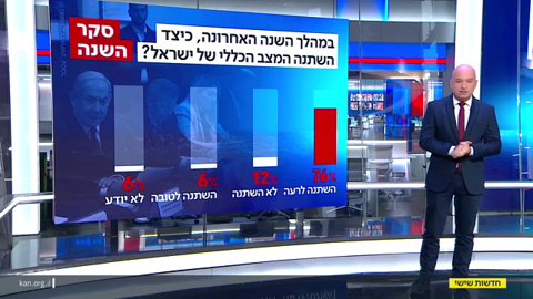 סקר השנה בישראל | סקר כאן חדשות שפורסם אתמול (שישי) העלה כי 76% מהנשאלים סבורים שהמצב הכללי של מדינת ישראל השתנה לרעה בשנה החולפת, בעוד 6% בלבד מאמינים שהוא השתנה לטובה. 12% חושבים שהוא לא השתנה ונותר כפי שהיה. בקרב מצביעי האופוזיציה בישראל 93% השיבו שהמצב השתנה לרעה, ומבין מצביעי הקואליציה, 61% סבורים כך.