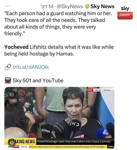 ליפשיץ ונורית קופר, בת 79 שוחררו אמש משבי חמאס בעזה. בעליהן, עמירם קופר ועודד ליפשיץ, שנחטפו יחד איתן, עדיין בשבי. השתיים הועברו לבית החולים איכילוב שם נפגשו עם משפחתן. דניאל, נכד של יוכבד ליפשיץ, פרסם תמונה מהמפגש וכתב: "לא להאמין שסבתא יוכקה שהיא כאמא עבורי חזרה אלינו משבי החמאס. כל כך אוהב את האישה הכל כך אמיצה הזו. גיבורה ענקית".