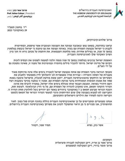 האוניברסיטה העברית הודיעה היום (ראשון) לחברת הסגל, פרופסור נדירה שלהוב-קיבורקיאן, שטענה ברשת שישראל עושה פשעי מלחמה לשקול לעזוב את משרתה. במכתב ששלחו נשיא ורקטור האוניברסיטה נכתב כי דבריה על כל שישראל מבצעת פשעי מלחמה הינם דברי הסתה עליהם ניתן לעמידה לדין, אף הם מצטערים שהיא חלק מקהילת האוניברסיטה.